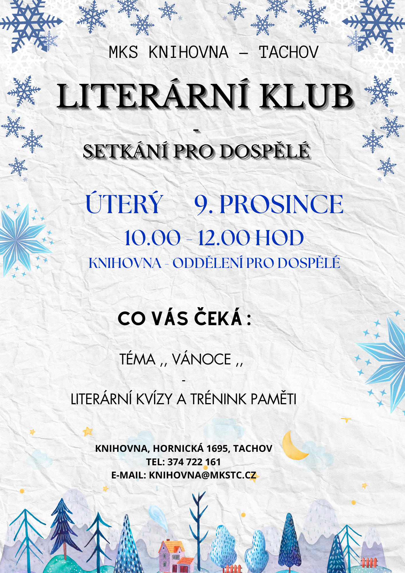 Pozvánka na literární klub – přijďte sdílet lásku ke knihám! Zveme vás na speciální vánoční setkání literárního klubu, kde se společně ponoříme do kouzla svátečních příběhů. V příjemné, klidné atmosféře si budeme povídat o knihách, které v sobě nesou vůni zimy a vánočního času.