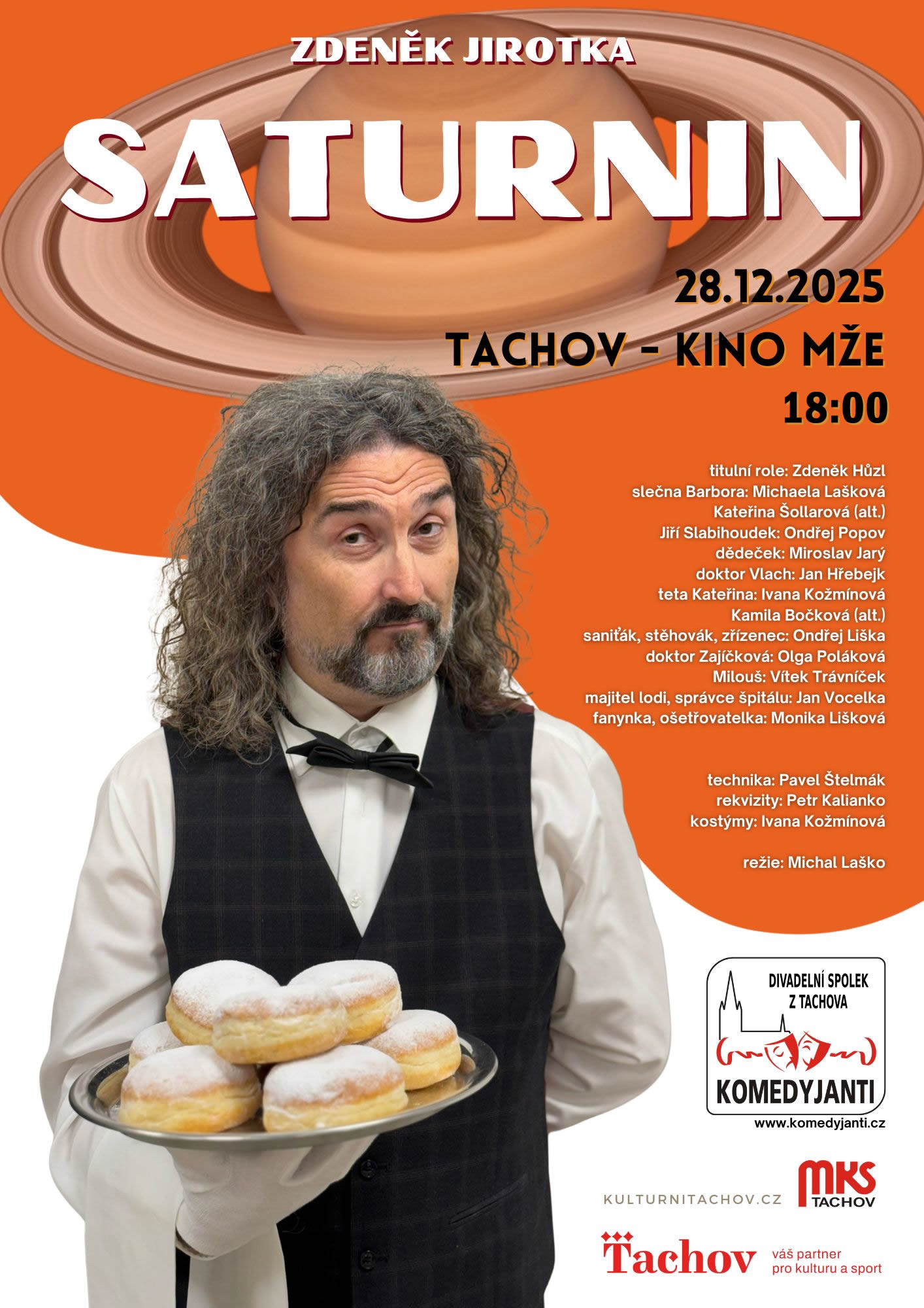 Divadelní představení Saturnin podle humoristického románu Zdeňka Jirotky přináší na jeviště příběh mladého muže Jiřího, jehož život výrazně ovlivní výstřední a nápaditý sluha Saturnin. Saturnin svým originálním přístupem zamotá hlavu nejen svému pánovi, ale i celé jeho svérázné rodině. Děj je nabitý bezpočtem komických situací, rafinovaných kanadských žertů a jemné ironie, která je Jirotkovu dílu vlastní. Diváci se setkají s legendární tetou Kateřinou, jejím synem Miloušem, dědečkem, slečnou Barborou, doktorem Vlachem a dalšími postavami, jejichž vzájemné vztahy vytvářejí prostor pro hravost, zábavu a poetickou retro komedii plnou noblesní atmosféry první republiky. Adaptace nabízí nejen veselí a nostalgii, ale také nenápadné životní ponaučení, že radost ze hry a nadhled si člověk může uchovat v každém věku.